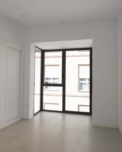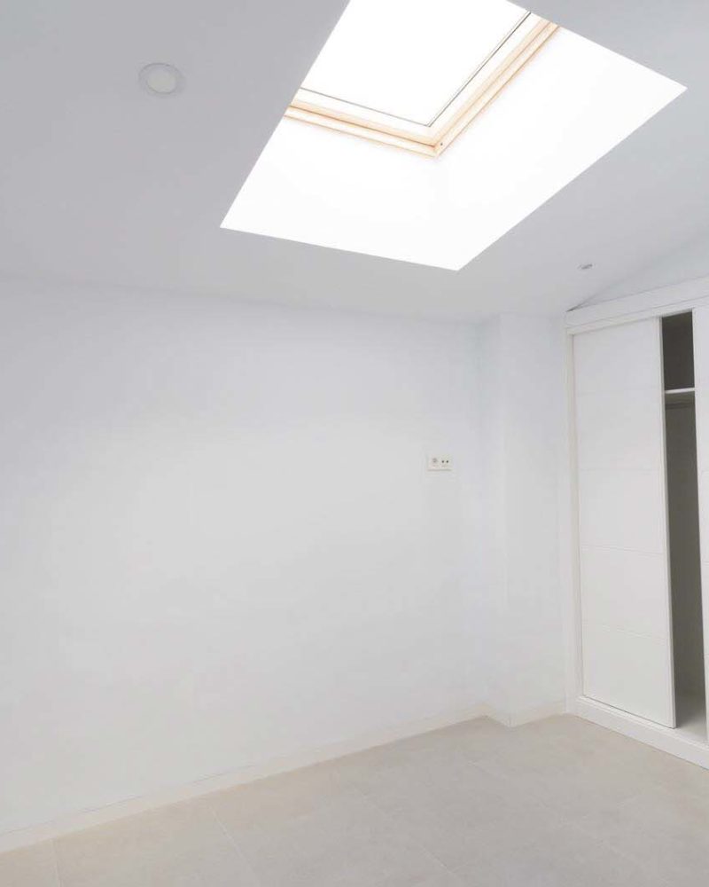 Cada habitación cuenta con su armario, en el que las puertas, lisas con unas coquetas ranuras tipo pico gorrión, estas son correderas con tiradores longitudinales de aluminio termolacado en blanco, y el interior está todo forrado en MELAMINA de color blanco.