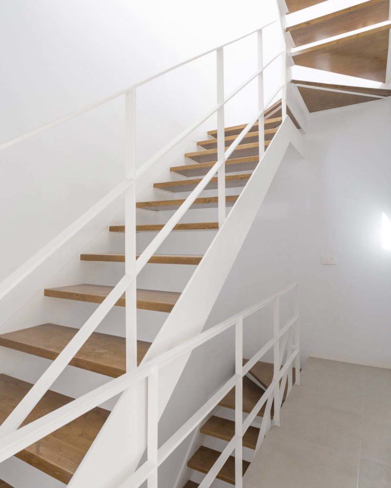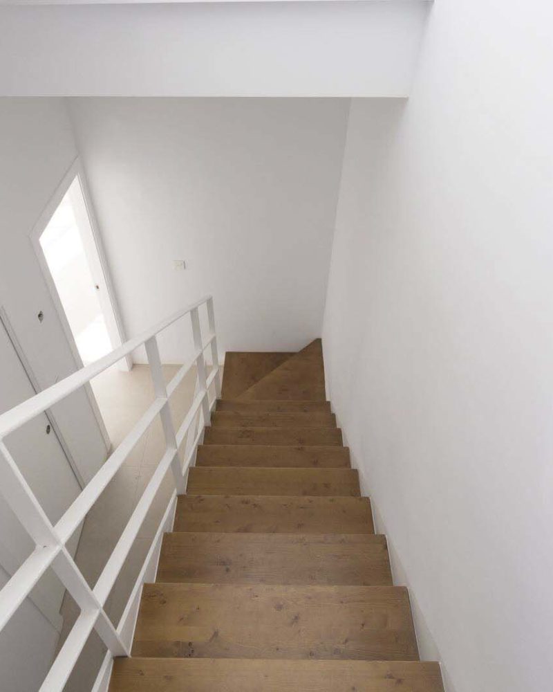 Con lo primero que nos encontramos al acceder a la vivienda es con una sofisticada escalera al aire con peldaños en madera de PINO alistonado de 40 mm de grosor, colocados sujetos a una estructura metálica, su diseño libera espacio y aporta sensación de ligereza y amplitud, y nos dan paso a las tres plantas habitables. En la zona principal contamos con una disposición muy acertada de cocina-comedor-salón, haciendo que aprovechemos toda la luz que entra por el mirador totalmente acristalado. Ya desde aquí comenzamos a ver las elegantes puertas que dan acceso a las habitaciones y baños, fabricadas en MDF y su galce y tapajuntas en material hidrófugo.
