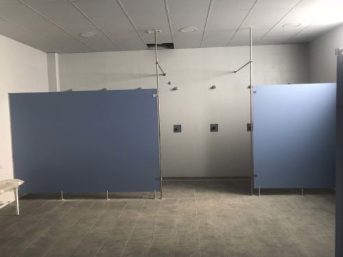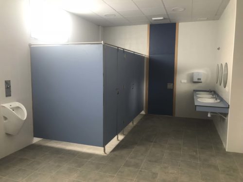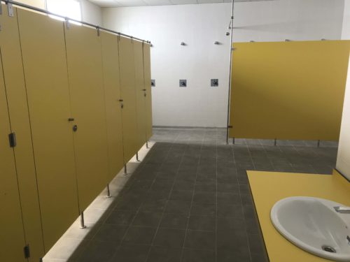 Si seguimos ojeando, en los baños podemos ver las cabinas sanitarias de tablero fenólico hidrófugo de 12 mm. tipo FUNDERMAX con herrajes en acero inoxidable, y las encimeras para los lavabos. En unos está de color amarillo y en otros de color azul.