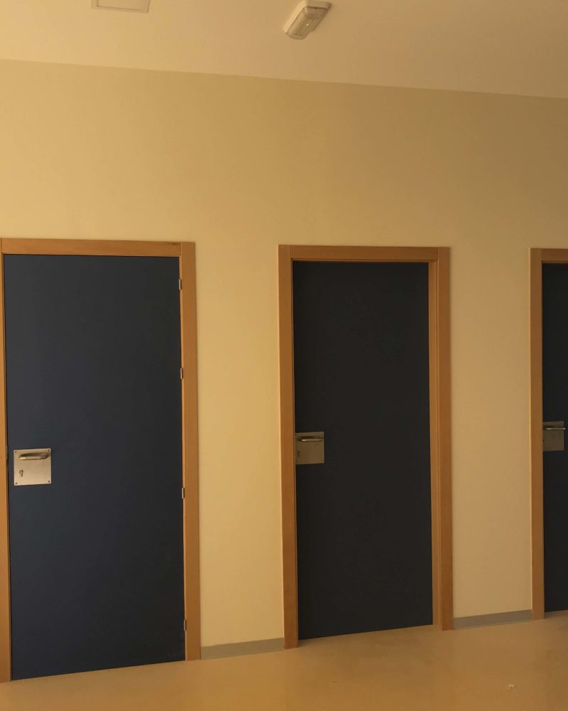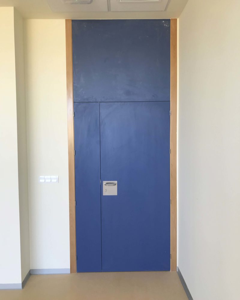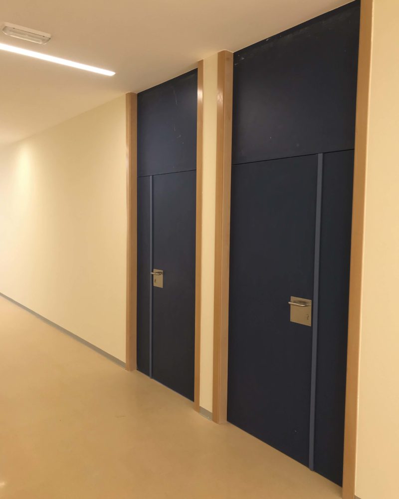 En este instituto se han instalado 30 puertas que dan acceso a las diferentes aulas, despacho, salas y baños. Se han fabricado en HPL (High Pressure Laminates o laminados de alta presión) en color azul marino con el cerco en Haya, quedando un gentil contraste. Algunas de ellas llevan una puerta pasiva al lado y un montante superior.