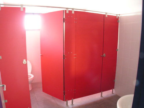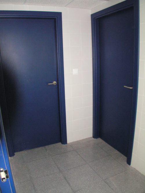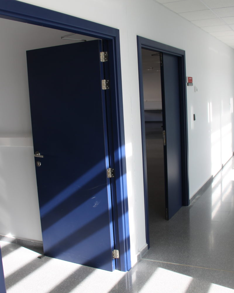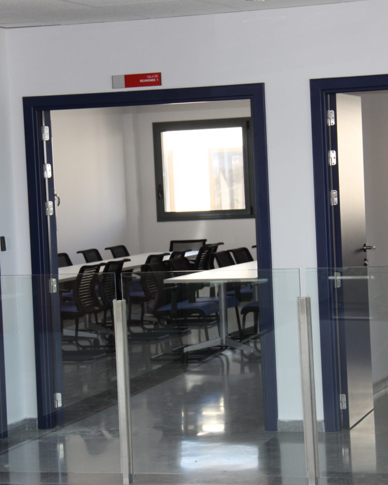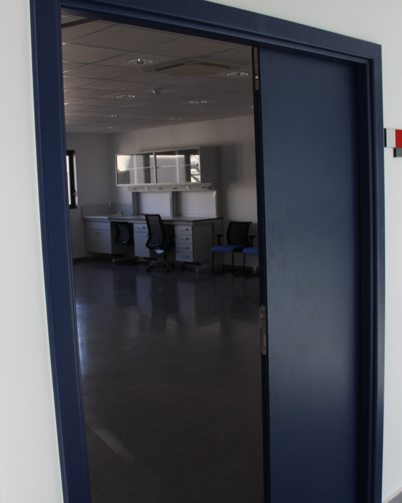 Este edificio de dos plantas está distribuido en diferentes oficinas, despachos, laboratorios y baños, en las que se instalaron puertas técnicas, fabricadas en HPL en color azul marino (High Pressure Laminates o laminados de alta presión), una solución decorativa muy completa, en el que se une el diseño, la calidad y la resistencia. Además, en el interior de los baños encontramos los módulos de cabinas en tablero compacto fenólico de TRESPA de 13 mm en color rojo, un material de gran duración y fácil mantenimiento.