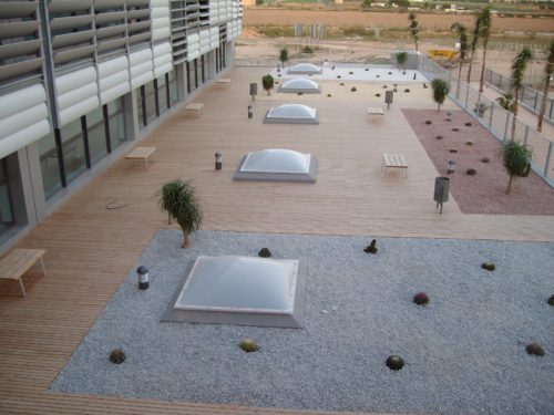 En el exterior se instalaron sobre 200 m2. de tarima elevada de madera de pino en autoclave, que es un tratamiento que se le aplica para aumentar su durabilidad frente a la constancia del sol y la humedad.