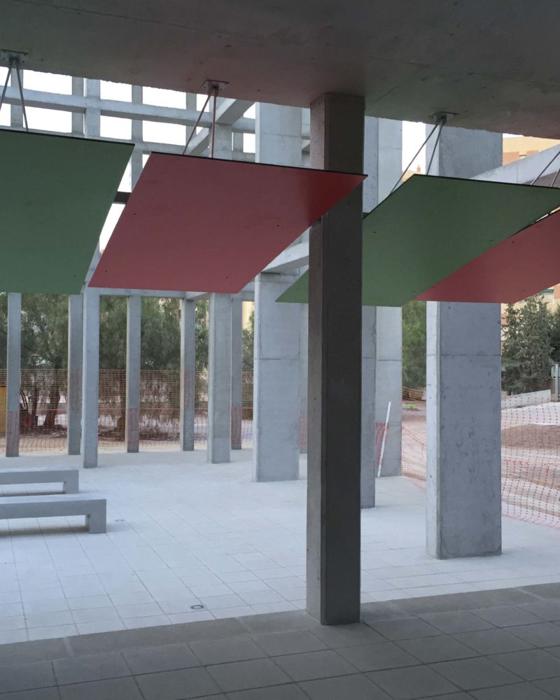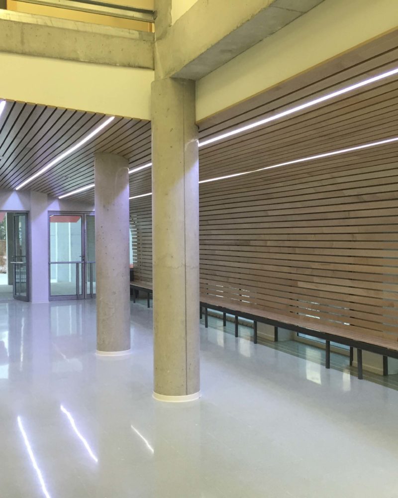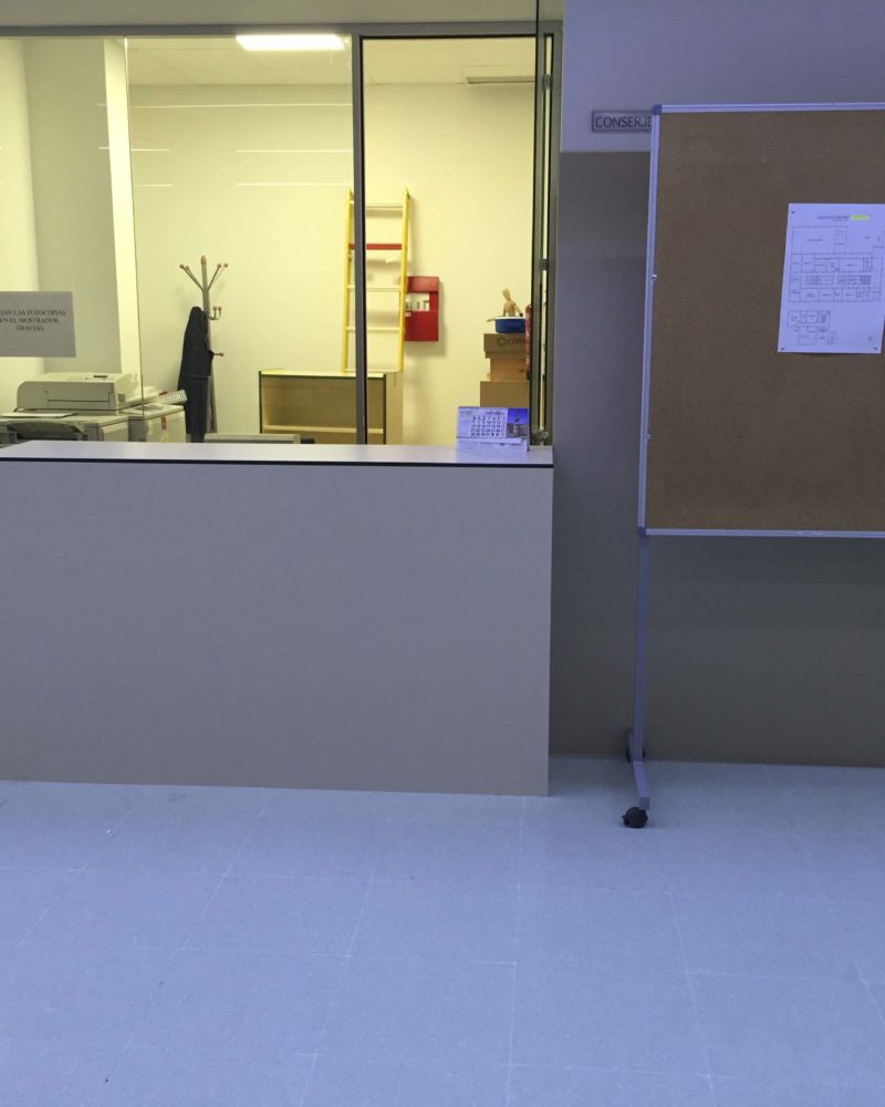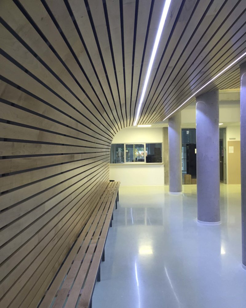 Justo encima de la puerta vemos unos tableros fenólicos tipo FUNDERMAX en color rojo y verde colgados del techo para proteger del sol la entrada, y si entramos al edificio nos encontramos con un mostrador de atención, fabricado en tablero compacto fenólico color crema, y frente a este, instalamos 1100 tablas de madera de ARCE formando un banco de espera en forma de olas.