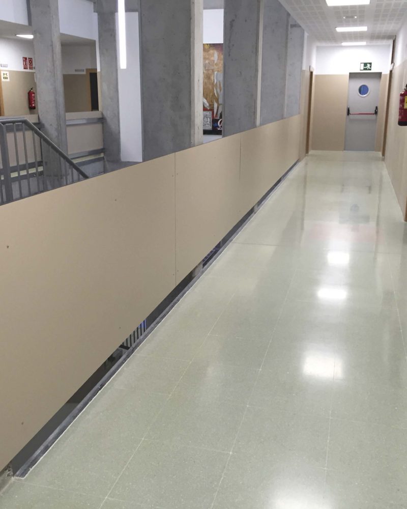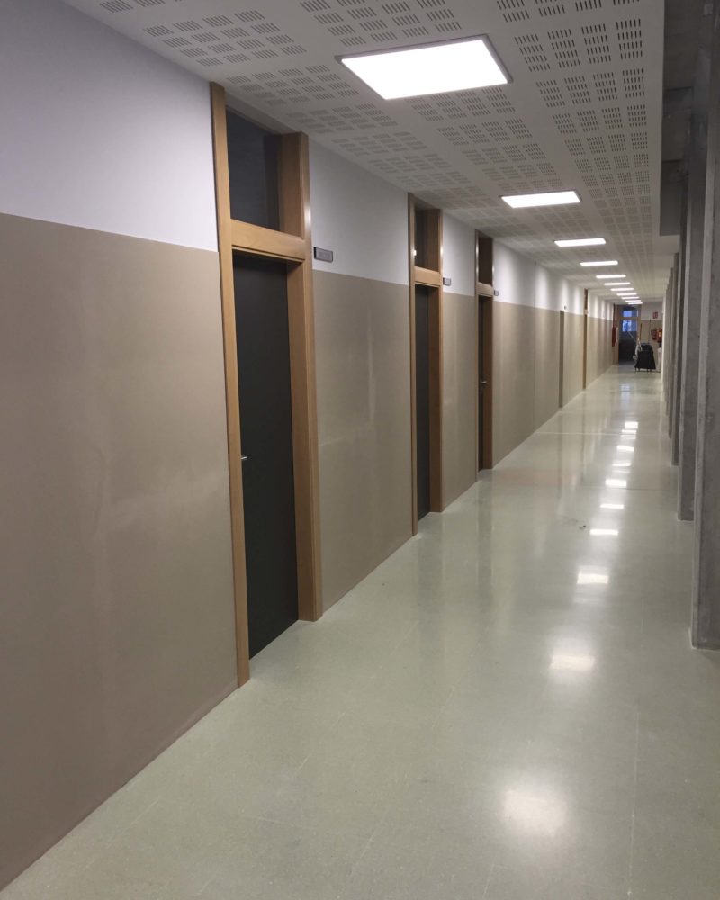 Si seguimos hacia dentro podemos observar las 105 puertas dobles de entrada a todas las aulas, con visor óptico en la puerta pasiva y con fijo superior, que se fabricaron en tablero aglomerado recubierto en melanina color gris antracita combinándolo con madera de haya vaporizada para los marcos y tapajuntas. Si subimos a planta 1ª y 2ª vemos que en los pasillos hay 120 ml de baranda de protección fabricada en tablero COMPACMEL de FINSA (compacto de madera) recubierto en melanina color crema.