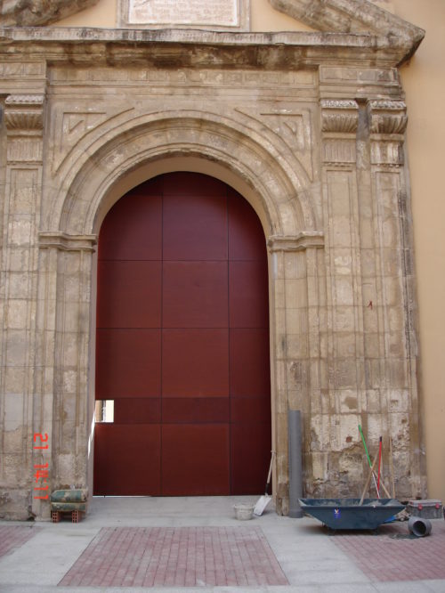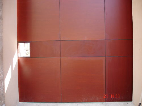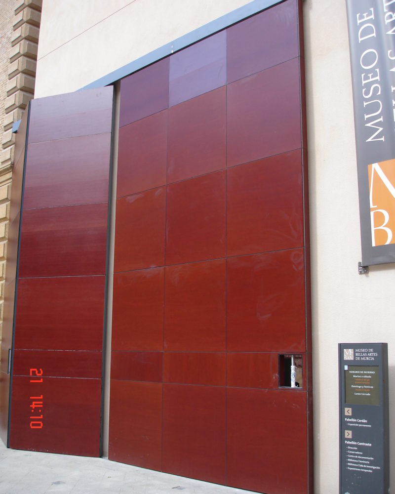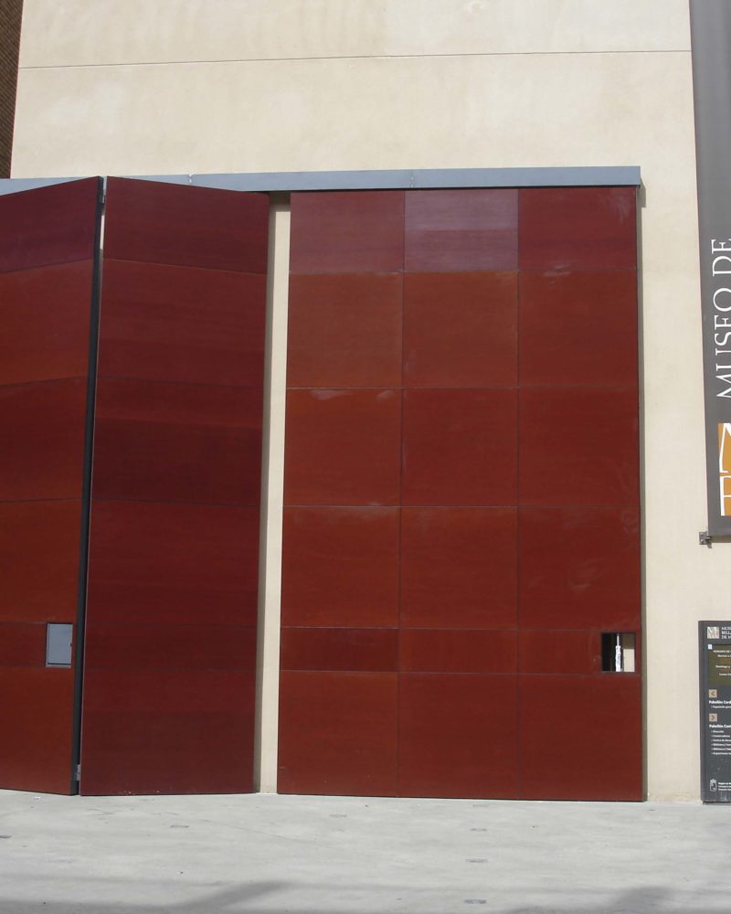 Se instalaron tres enormes puertas de entrada, a los diferentes pabellones, de más de cuatro metros de altura, fabricadas con tablero compacto fenólico tipo PARKLEX para exterior, chapado en madera.