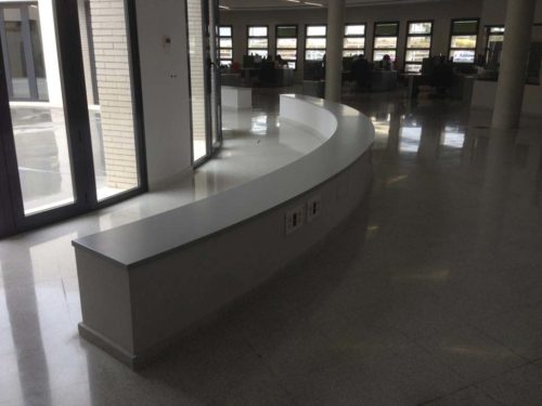 También se instaló un banco de espera, que llama la atención por tener el mismo radio curvo que tiene el edificio, está fabricado en MDF (Medium Density Fibreboard o Fibropanel de Densidad Media), y lacado en color gris.