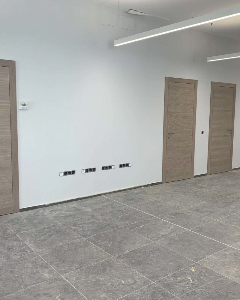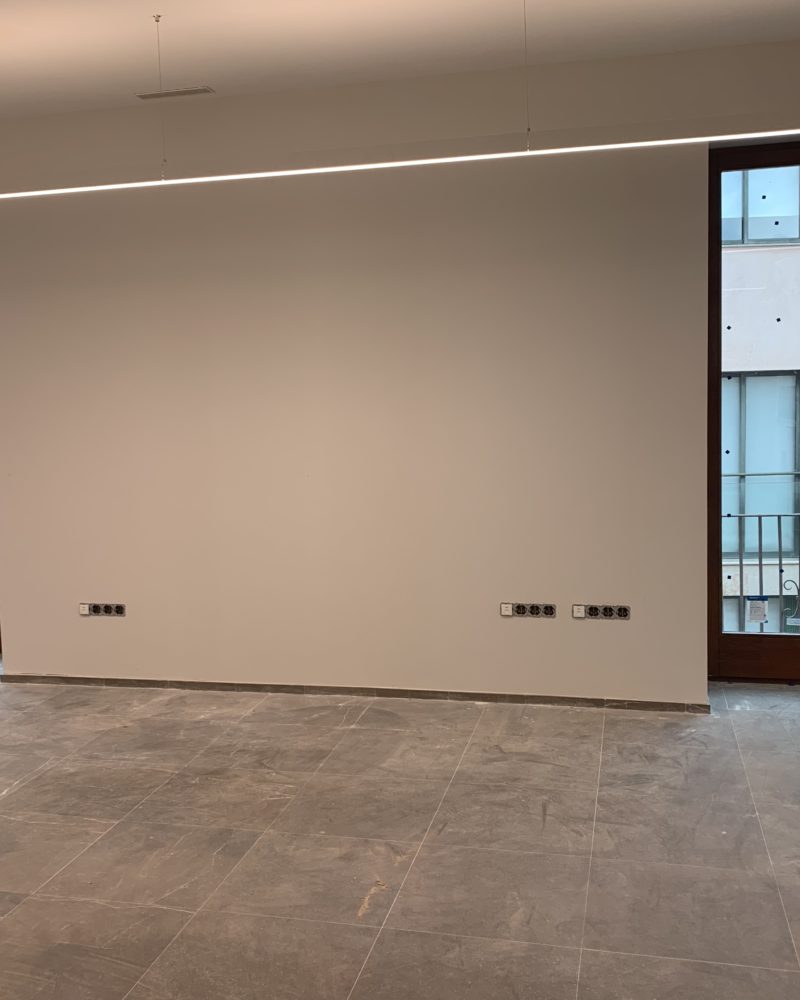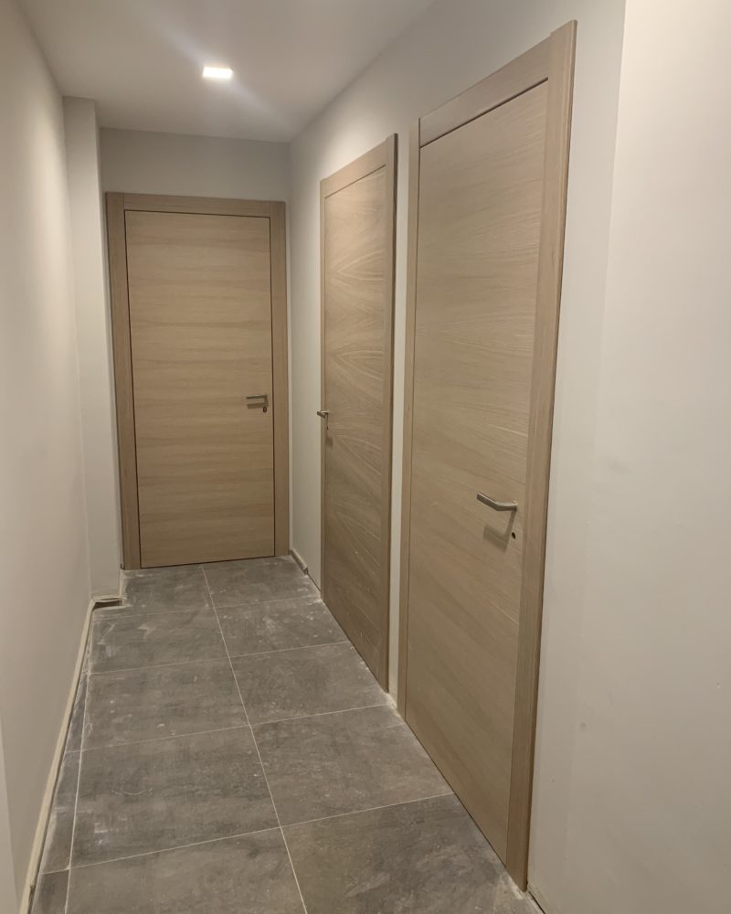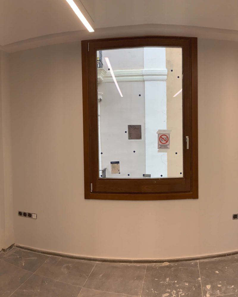 Desde el exterior podemos observar que las ventanas son de madera de roble laminado tintadas en cerezo de CARINBISA que nos aporta una mayor durabilidad y un menor mantenimiento. En el interior tenemos que subir hasta la primera planta para ver carpintería de madera en la que todas las puertas de despachos son RF60 (resistente al fuego 60 minutos) fabricadas en madera de ROBLE AMERICANO con la veta en horizontal llevando un tratamiento blanqueante, estas están todas enrasadas al tapajuntas en la cara del pasillo, también conseguimos que todo el herraje fuera lo más oculto posible por lo que instalamos manillas con mini roseta de HOPPE, bisagras ocultas INTHER y cierra puertas ocultos de GEZE.